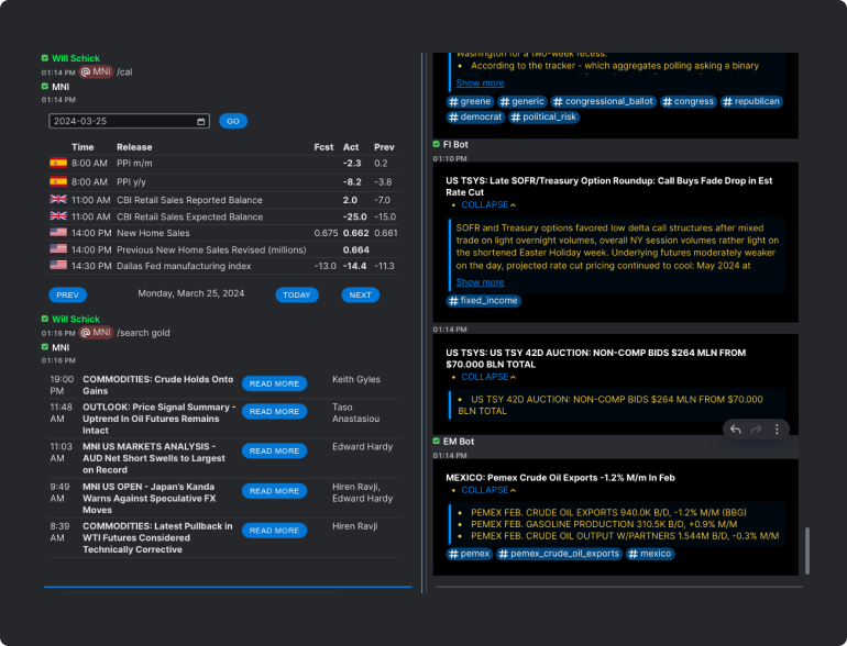 MNI News and Data bots provide real-time news feeds and a calendar of data releases.