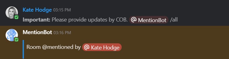 The ability to @mention everyone in a room to get their attention comes as standard or share urgent group messages and updates with room members quickly comes as standard in Symphony Messaging. However to @mention everyone in a room with more than 30 users you need connect to our @MentionBot.