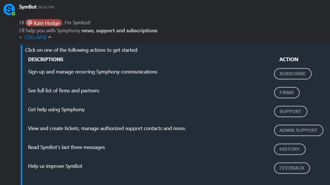 SymBot provides information on Symphony events and training, community news and developer updates.