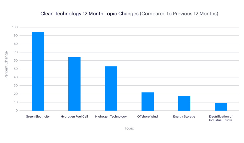 We saw an increase in a variety of topics concerning hydrogen in 2023. We also saw an increase of 9% in mentions of “electrification of industrial trucks”. This was a phrase we saw frequently in Earnings Calls as companies are upgrading their fleets to run with more electric vehicles and in other cases hydrogen fuel cell trucks.
