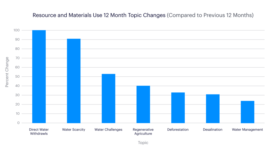 As predicted, water had a more prominent role in 2023 than in past years. Traditionally conversations around water use have been limited to a handful of industries centered around food & beverage and manufacturing. This year however there was increased discussion about water use for the Tech sector, particularly on the topic of water used to cool data centers. This issue was prominent enough that several major Tech companies featured disclosure around increased water use in their sustainability reports.