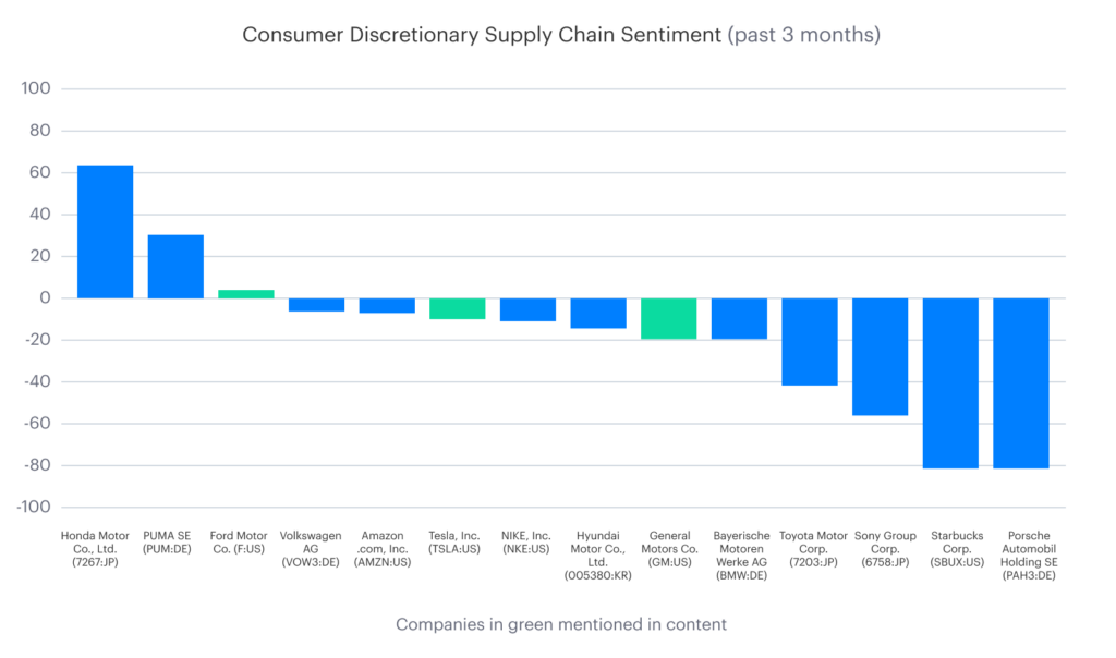 Supply chain sentiment in the Consumer Discretionary space has also been taking its time to bounce back. This is due primarily to the variable nature of the automotive industry, coupled with an increasing demand for electric vehicles. Electric vehicles—a relatively new consumer good compared to internal combustion engine (ICE) vehicles—require their own supply chain, and that supply chain is still growing and evolving. In this section we unpack how the major automotive producers have been dealing with their EV-related supply chains in recent months.