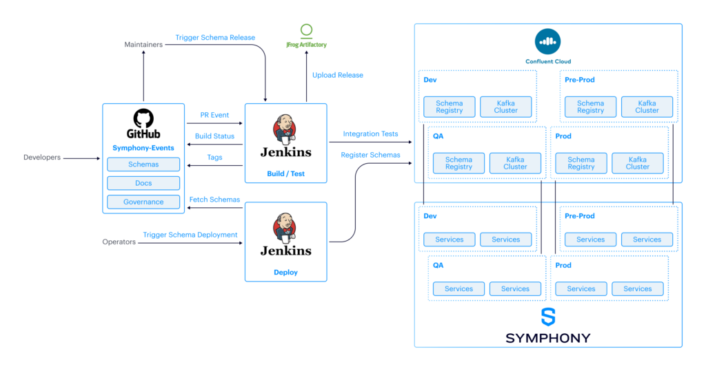At Symphony, we deliver software as a service on top of a multi-tenant microservice architecture. We therefore complement the model with metadata information, conveyed through headers, to help with the identification and processing of events, such as a tenant ID for segregation, a trace ID for tracing flows across services, and an event type for filtering.