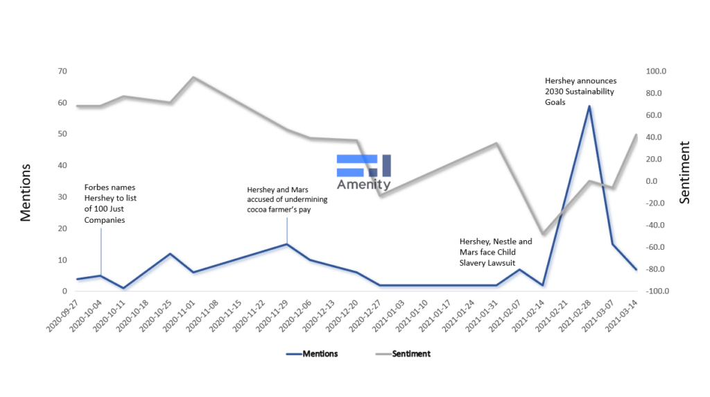 ESG Safeguard Platform: Hershey Mentions and Sentiment, Past 6 Months