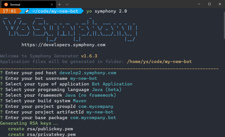 Creating a BDK 2.0 project scaffold uses the same Yeoman Bot Generator used in the SDKs. Simply issue the command “yo symphony 2.0” and answer a series of questions concerning your environment and project. The generator will proceed to generate an RSA keypair, create the necessary project files including configuration and launch an initial build to ensure everything works. You can then open the project in your favorite editor and immediately launch the bot to test it, essentially getting started in seconds from scratch.