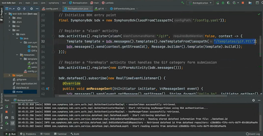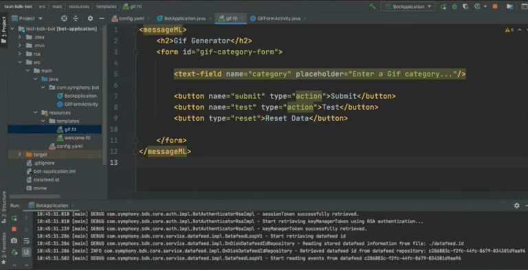 Message templating makes it easy to separate static content from logic, which is necessary for complex messages. The Symphony Bot generator provides a number of freemarker templates out of the box, such as the one referenced in the “/gif” command activity.