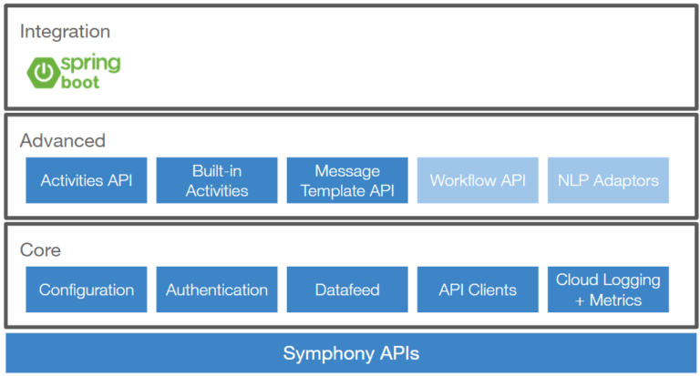 What does this mean in practice for developers? The BDK 2.0 is essentially an ecosystem of components rather than a single opinionated structure. The core layer builds upon the Symphony REST APIs and provides basic features required to wire up a bot, similar to the role of the existing SDKs. The advanced layer then provides optional abstractions such as the Activities and Message Templating APIs. At the top, the integration layer wraps up BDK 2.0 for use in a framework like Spring Boot so that it feels native to framework developers.