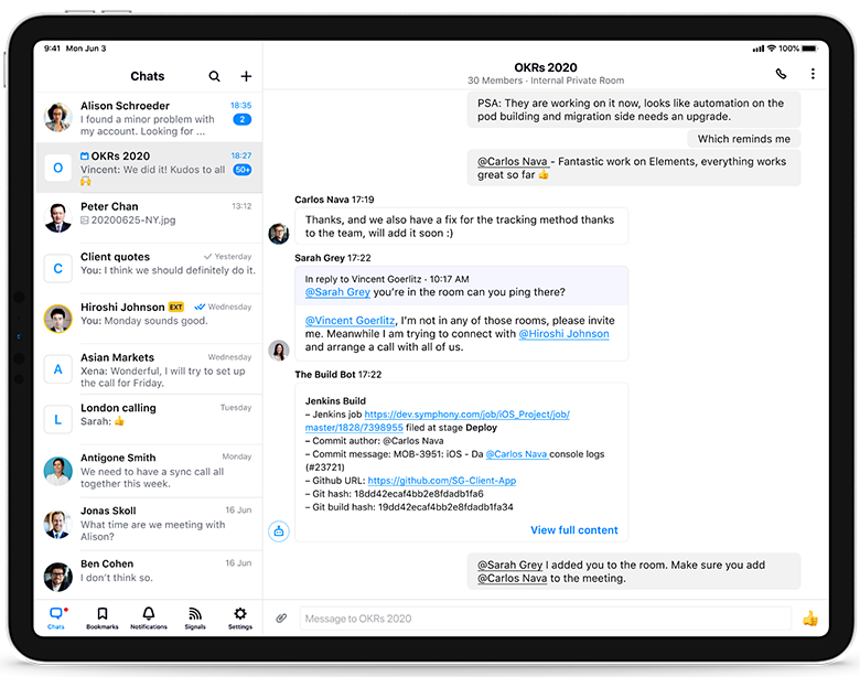 Speed and performance are crucial to members of the Symphony community. Just like the Symphony 2.0 desktop experience, the new app offers a faster, more stable mobile experience. This means our customers can count on the app to function while they are in transit, all over the world.