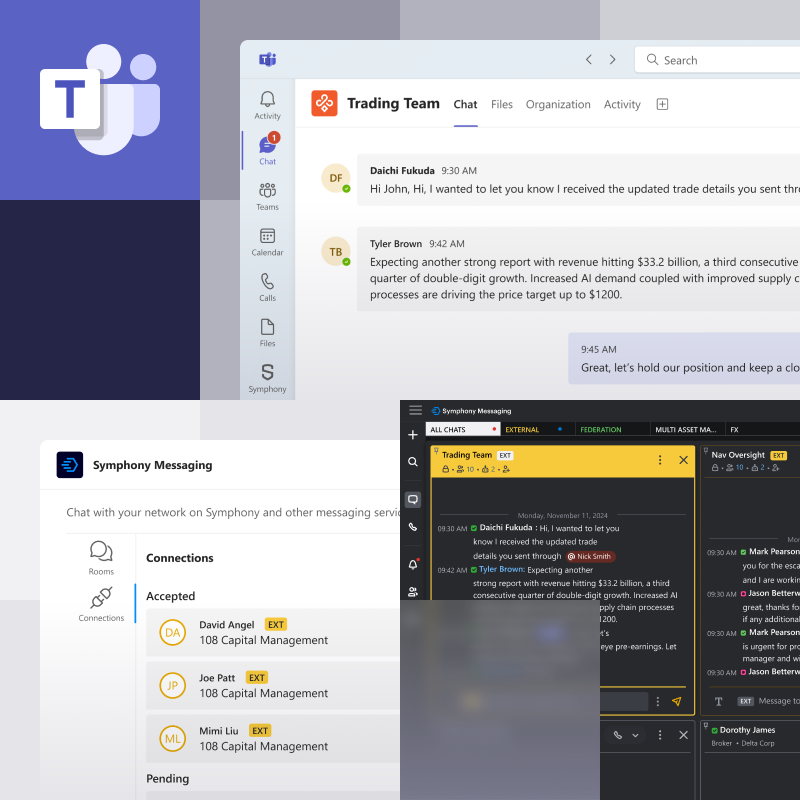 The ideal choice for existing Symphony users and back-office teams who need to bridge the gap across their organization. It enables intra-firm connectivity, allowing employees on Symphony to message internal colleagues who use Microsoft Teams. Connecting teams across the organization and reducing communication breakdowns.