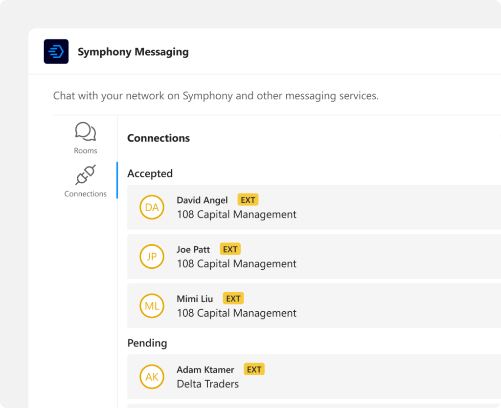 From either application, access the Symphony community for compliance-enabled collaboration. Connect with external contacts and consumer channels or seamlessly access internal colleagues across platforms.