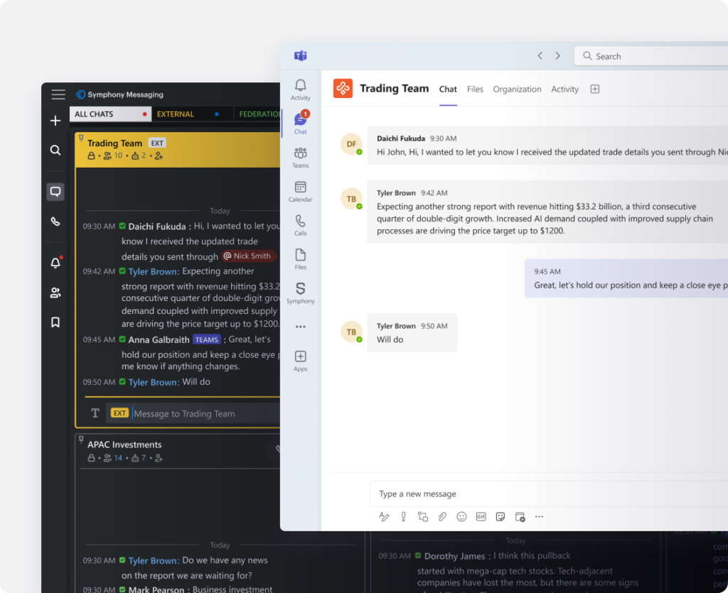 Combined together, Symphony Messaging and Microsoft Teams can provide a foundation for global financial institutions to enable secure, efficient connectivity and collaboration within and beyond organizational boundaries.