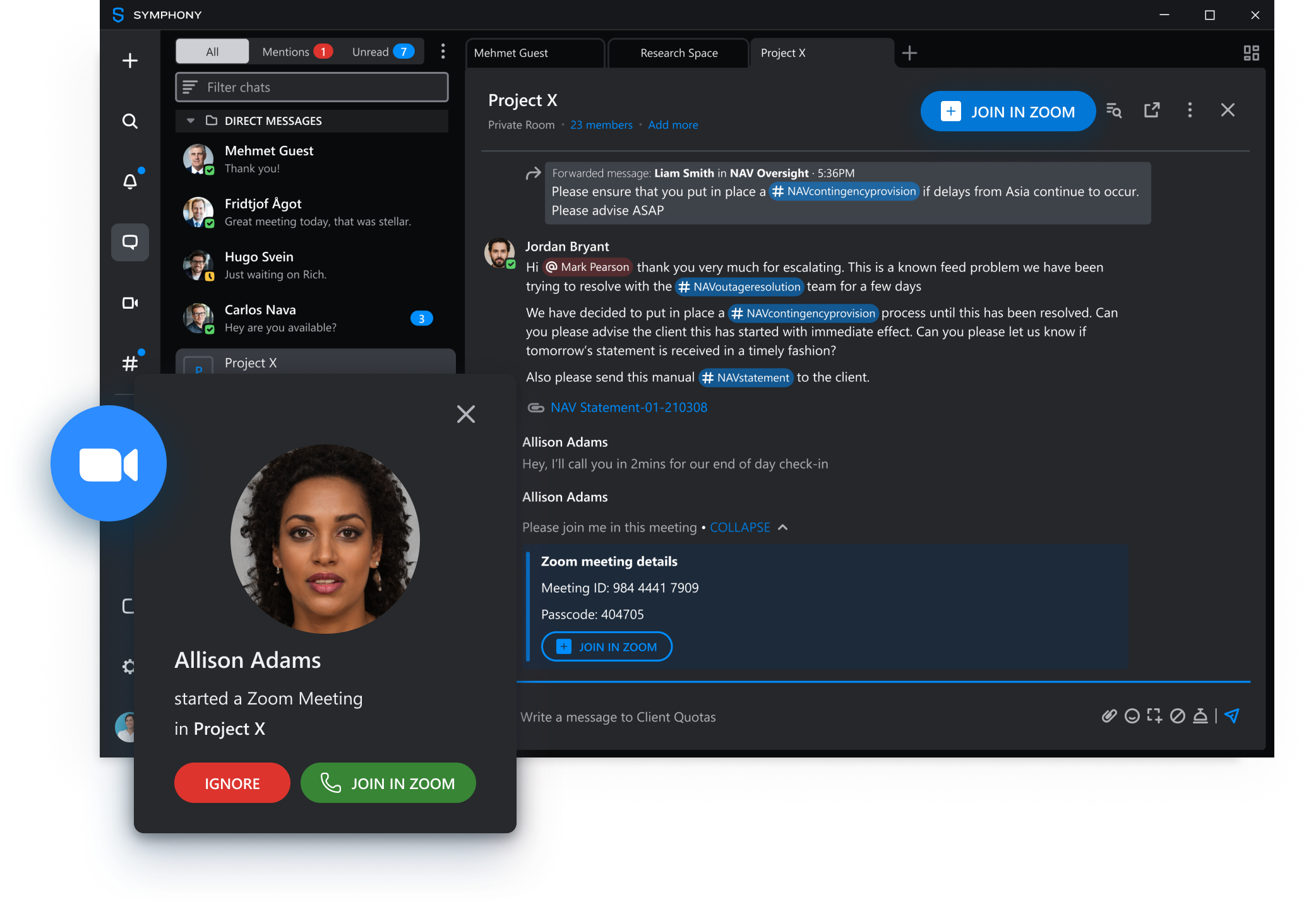 Chat and share files during Zoom meetings directly in secure Symphony rooms