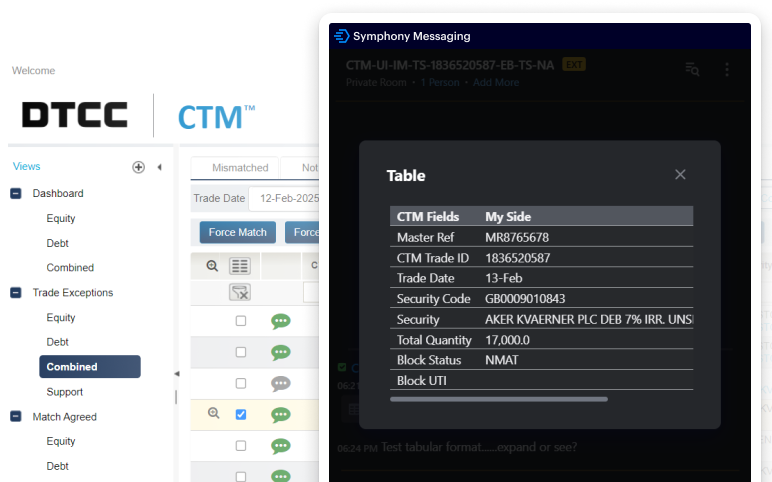Symphony Messaging is embedded within the CTM user interface (UI), allowing counterparties to seamlessly match and confirm trades without switching platforms.